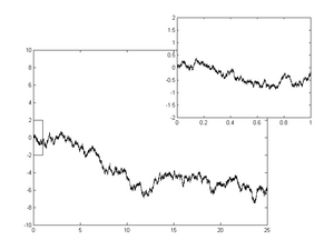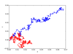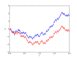 In mathematics, the Wiener process is a real-valued continuous-time stochastic process named in honor of American mathematician Norbert Wiener for his investigations on the mathematical properties of the one-dimensional Brownian motion.[1] It is often also called Brownian motion due to its historical connection with the physical process of the same name originally observed by Scottish botanist Robert Brown. It is one of the best known Lévy processes (càdlàg stochastic processes with stationary independent increments) and occurs frequently in pure and applied mathematics, economics, quantitative finance, evolutionary biology, and physics.