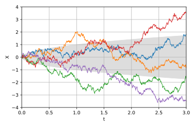 Let [math]\displaystyle{ \xi_1, \xi_2, \ldots }[/math] be i.i.d. random variables with mean 0 and variance 1. For each n, define a continuous time stochastic process [math]\displaystyle{ W_n(t)=\frac{1}{\sqrt{n}}\sum\limits_{1\leq k\leq\lfloor nt\rfloor}\xi_k, \qquad t \in [0,1]. }[/math] This is a random step function. Increments of [math]\displaystyle{ W_n }[/math] are independent because the [math]\displaystyle{ \xi_k }[/math] are independent. For large n, [math]\displaystyle{ W_n(t)-W_n(s) }[/math] is close to [math]\displaystyle{ N(0,t-s) }[/math] by the central limit theorem. Donsker's theorem asserts that as [math]\displaystyle{ n \to \infty }[/math], [math]\displaystyle{ W_n }[/math] approaches a Wiener process, which explains the ubiquity of Brownian motion.[5]