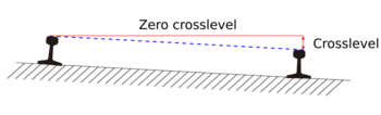 Crosslevel (or 'cross level') is the measurement of the difference in elevation (height) between the top surface of the two rails at any point of railroad track. The two points (each at the head of each rail) are measured at by the right angles to the reference rail. Since the rail can slightly move up and down, the measurement should be done under load.