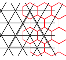 With the dual tiling system is possible to transform the big triangular faces (gray) into small centered-hexagons (red), and vice versa.