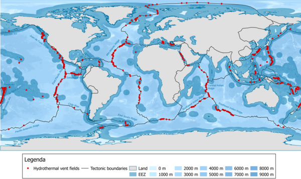 Hydrothermal vents are distributed along the Earth's plate boundaries, although they may also be found at intra-plate locations such as hotspot volcanoes. As of 2009 there were approximately 500 known active submarine hydrothermal vent fields, with about half visually observed at the seafloor and the other half suspected from water column indicators and/or seafloor deposits.[84] The InterRidge program office hosts a global database for the locations of known active submarine hydrothermal vent fields.