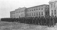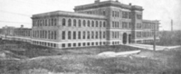 Lowell State College got its start as the Lowell Normal School, which was chartered in 1894 as a teacher-training institution for women. The 10th and final normal school to be established in Massachusetts, it opened in 1898 with 108 students and five faculty members. The original classroom building opened the next year at the corner of Broadway and Wilder streets, and quickly became a landmark in the city.[11] Designed by local firm Stickney & Austin, it reflects the fashion of the time: high-style Beaux Arts with classical symmetry, arches, cast-iron lampposts and yellow brick. Its design was influenced in part by Lowell High School, which was also designed by Lowell native Frederick W. Stickney. Frank Coburn, for whom the hall was later named, served as the school's first principal until 1908.[12]