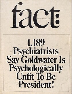 During the 1964 race, Fact magazine published a special issue titled "The Unconscious of a Conservative: A Special Issue on the Mind of Barry Goldwater". The editor, Ralph Ginzburg, had commissioned a poll of psychiatrists and printed that "1,189 psychiatrists say Goldwater is psychologically unfit to be president!" Goldwater sued Ginzburg and won in court (Goldwater v. Ginzburg)