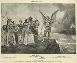 In 1895, when Wilhelm had a famous painting done by Hermann Knackfuss popularly known as "The Yellow Peril" depicting a nightmare he had with a Buddha wreathed in fire being carried by an Asian-style dragon threatening Europe meant to symbolize the "Yellow Peril" as the alleged Asian threat to Europe was known, Eulenburg who shared Wilhelm's hatred of Asians was enthralled with the painting.[68] On 29 September 1895, Eulenburg wrote to the Empress saying about the Yellow Peril painting: "I am quite under the spell of this truly magnificent work. The idea is uplifting and the execution masterly. When I immerse myself in the contemplation of the picture I am filled with the feeling that all Europe must indeed answer the call of the beloved Kaiser to unite in peaceful harmony for the sake of the cross and the dearest goods, but then the uneasy feeling steals over me that the evil in those men who oppose as an enemy power the good which manifests itself in the Kaiser's being will now cause them to tear down and attack with their ingenious criticism that which has sprung from the high-mindedness and noble heart of the Kaiser".[68] To his mother Eulenburg wrote about the Yellow Peril painting: "The Kaiser has given me a magnificent engraving of the wonderful allegorical picture executed by Prof. Knackfuss from His Imperial Majesty's sketch: the peoples of Europe are represented as female figures, are called upon by St. Michael to defend the cross against unbelief, heathenism, etc. You will like it...It is a beautiful idea in a beautiful form".[68] Eulenburg's "unforgettable friend" Gobineau had been obsessed with the fear of the "Yellow Peril" which he had expressed in his epic 1881 poem Amadis where the European civilization is destroyed by a Chinese invasion.[69] Much of Wilhelm's anti-Asian racism and warnings of the "Yellow Peril" very closely resembles Gobineau's writings on the Chinese, which is not surprising given that Eulenburg had introduced the Kaiser to Gobineau's theories.[70] The American historian Gregory Blue wrote about the "Eulenburg connection" where Eulenburg played a key role in introducing the Kaiser to Gobineau's anti-Asian writings.[70] Furthermore, Blue noted that the sketch that Wilhelm had drawn of his nightmare in April 1895 looks very different than The Yellow Peril painting that Knackfuss finished in September 1895, being considerably more disturbing and nightmarish than the finished product, and as much of the imagery in the painting appears to be drawn from Amadis, he argued that the "Eulenburg connection" at work here with Eulenburg playing a major, if uncredited role in creating The Yellow Peril painting.[70]