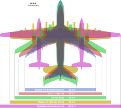 On April 13, 2019, the Stratolaunch aircraft made its maiden flight, reaching 15,000 ft (4,600 m) and 165 kn (305 km/h) in a 2 h 29 min flight.[65][66] Stratolaunch CEO Jean Floyd offered this comment: "We dedicate this day to the man who inspired us all to strive for ways to empower the world's problem-solvers, Paul Allen. Without a doubt, he would have been exceptionally proud to see his aircraft take flight". Upon its flight, the airplane became the largest in history by wingspan.[67]