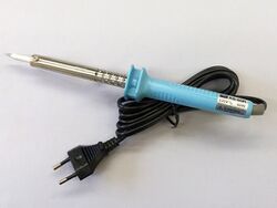 For electrical and electronics work, a low-power iron, a power rating between 15 and 35 watts, is used. Higher ratings are available, but do not run at higher temperature; instead there is more heat available for making soldered connections to things with large thermal capacity, for example, a metal chassis.[15] Some irons are temperature-controlled, running at a fixed temperature in the same way as a soldering station, with higher power available for joints with large heat capacity. Simple irons run at an uncontrolled temperature determined by thermal equilibrium; when heating something large their temperature drops.