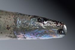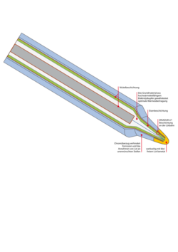 Iron-plated tips may feature a layer of nickel between the copper core and the iron surface.[22] A nickel-chrome outer plating may be used further back from the very tip, as solder does not stick well to this material: this avoids solder wetting parts of the tip where it would be unwanted.[22]