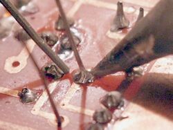 Pyramid tips with a triangular flat face and chisel tips with a wide flat face are useful for soldering sheet metal. Fine conical or tapered chisel tips are typically used for electronics work. Tips may be straight or have a bend. Concave or wicking tips with a chisel face with a concave well in the flat face to hold a small amount of solder are available.[26][27] Tip selection depends upon the type of work and access to the joint; soldering of 0.5mm pitch surface-mount ICs, for example, is quite different from soldering a through-hole connection to a large area. A concave tip well is said to help prevent bridging of closely spaced leads; different shapes are recommended to correct bridging that has occurred.[28] Due to patent restrictions not all manufacturers offer concave tips everywhere; in particular there are restrictions in the USA.[28]