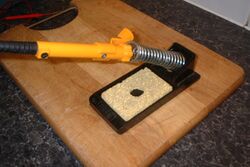 A soldering iron stand keeps the iron away from flammable materials, and often also comes with a cellulose sponge and flux pot for cleaning the tip. Some soldering irons for continuous and professional use come as part of a soldering station, which allows the exact temperature of the tip to be adjusted, kept constant, and sometimes displayed.