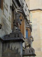 In 1508, grotesques known as hieroglyphics were added to the Cloister. These are thought to be allegorical, and include four hieroglyphics in front of the old library that represent scholarly subjects: science, medicine, law, and theology.[33][34] The other hieroglyphics have been assigned symbolism relating to virtues that should be encouraged by the college (e.g. the lion and pelican grotesques in front of the Senior Common Room representing courage and parental affection) or vices that should be avoided (the manticore, boxers, and lamia in front of the Junior Common Room, representing pride, contention, and lust).[34] In 2017, repair work was undertaken to restore the severely damaged boxers statue.[35]