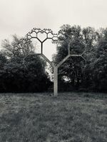 Further east of the water meadow are Bat Willow meadow and the Fellows' Garden. They are separated from the water meadow and each other by other branches of the Cherwell, and may be accessed from Addison's Walk. Bat Willow meadow features Y, a 10 metre high sculpture of a branching tree by Mark Wallinger, commissioned for the college's 550th anniversary in 2008.[67][68] Due to their age and infection with honey fungus, the willow trees were cut down in 2018 and replanted, and the wood used to make cricket bats.[69]