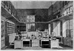 Daubeny, who was also the Aldrichian Professor of Chemistry, had found the chemistry laboratory in the basement of the old Ashmolean Museum, what is now the History of Science Museum, to be "notoriously unworthy of a great University" and desired a better science facility. He petitioned the college to be allowed to build one, and the Daubeny laboratory was completed in 1848.[47][50] The Daubeny Laboratory was preceded by the anatomy school and laboratory at Christ Church which opened in 1767, and would be followed later in the century by other college laboratories including the Balliol-Trinity Laboratories.[51] Daubeny's laboratory was a two-storey room with benches and cupboards encircled by a gallery, and became the principal chemistry lab for the university. In 1902, due to growing student numbers and poor ventilation, the laboratory trappings were removed and it was refitted as a lecture hall.[47] In 1973, most of the Daubeny Laboratory building was reconfigured into graduate student accommodation.[52] The Daubeny lab itself is now a conference space.