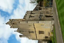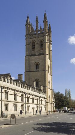 Construction of Magdalen's Great Tower began in 1492 by another mason, William Raynold. It might have been intended to replace an existing belfry remaining from the hospital, and probably was originally envisioned to stand alone. By the time it was completed in 1509, additional buildings had been built either side, creating the roughly triangular Chaplain's quad between the chapel and the High.[9]