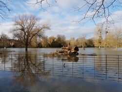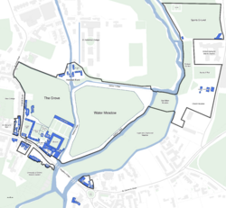 The water meadow is a flood-meadow to the eastern side of the college, bounded on all sides by the Cherwell. In wet winters, some or all of the meadow may flood, as the meadow is lower lying than the surrounding path. All around the edge of the meadow is a tree-lined path, Addison's Walk, named for the fellow Joseph Addison (1672–1719), which connects to Holywell Ford and the Fellows' Garden.[63]