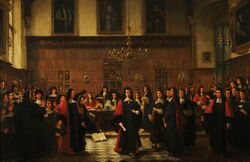 The expulsion of the fellows marked a turning point in the university's relationship with the Crown: Brockliss writes, "the royalist and Anglican University established at the Restoration had had to make a choice and it had chosen Anglicanism."[19] James' interference with the college fed resentment in Anglicans who used it as evidence that his rule was autocratic.[19][21] On 25 October 1688, shortly before the Glorious Revolution and overthrow of James II by William of Orange, James' appointments were reversed and Hough and the expelled fellows were restored to the college.[19][21] This event is marked every year at a special banquet, the Restoration Dinner, for Magdalen fellows, demies, and academic clerks.[21]
