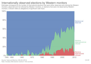 The first monitored election was that of an 1857 plebiscite in Moldavia and Wallachia (current Romania) that was monitored by most of the major European powers. Election monitoring was uncommon until after World War II. During the 1960s, less than 10% of elections were monitored.[2] Election observation activities have expanded significantly following the end of the Cold War, along with the development of international standards on the conduct of democratic elections and the process of monitoring elections by both international[3] and domestic[4] observing organizations. By the 2000s, about 80% of all elections were observed.[2]