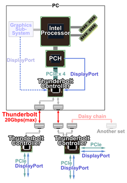 Thunderbolt controllers multiplex one or more individual data lanes from connected PCIe and DisplayPort devices for transmission via two duplex Thunderbolt lanes, then de-multiplex them for use by PCIe and DisplayPort devices on the other end.[2] A single Thunderbolt port supports up to six Thunderbolt devices via hubs or daisy chains; as many of these as the host has DP sources may be Thunderbolt monitors.[11]