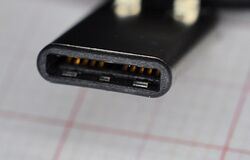 Thunderbolt 3 is a hardware interface developed by Intel.[74] It shares USB-C connectors with USB, supports USB 3.1 Gen 2,[75][76][77] and can require special "active" cables for maximum performance for cable lengths over 0.5 meters (1.5 feet). Compared to Thunderbolt 2, it doubles the bandwidth to 40 Gbit/s (5 GB/s). It allows up to 4 lanes of PCI Express 3.0 (32.4 Gbit/s) for general-purpose data transfer, and 4 lanes of DisplayPort 1.4 HBR3 (32.40 Gbit/s before 8/10 encoding removal, and 25.92 Gbit/s after) for video,[78] but the maximum combined data rate cannot exceed 40 Gbit/s; video data will be using all needed speed, limiting PCIe data. DP 1.2 support is mandatory, while DP 1.4 is optional. Other overheads are possible on PCIe data (1.5% of 128b/130b is also removed) and Thunderbolt 3 protocol (you either optimise for speed or for latency), the last one gives only 21.6 Gbit/s to 25 Gbit/s.[79] Thunderbolt 3 uses 64b/66b encoding after that, which means the real rate is bigger than 40 Gbit/s, 2 times 20.625 Gbit/s.