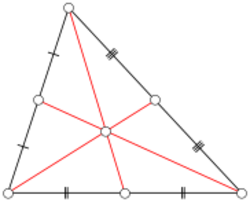 A median of a triangle is a straight line through a vertex and the midpoint of the opposite side, and divides the triangle into two equal areas. The three medians intersect in a single point, the triangle's centroid or geometric barycenter, usually denoted by G. The centroid of a rigid triangular object (cut out of a thin sheet of uniform density) is also its center of mass: the object can be balanced on its centroid in a uniform gravitational field. The centroid cuts every median in the ratio 2:1, i.e. the distance between a vertex and the centroid is twice the distance between the centroid and the midpoint of the opposite side.