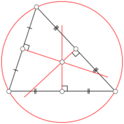 A perpendicular bisector of a side of a triangle is a straight line passing through the midpoint of the side and being perpendicular to it, i.e. forming a right angle with it. The three perpendicular bisectors meet in a single point, the triangle's circumcenter, usually denoted by O; this point is the center of the circumcircle, the circle passing through all three vertices. The diameter of this circle, called the "circumdiameter", can be found from the law of sines stated above. The circumcircle's radius is called the "circumradius".