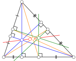The orthocenter (blue point), center of the nine-point circle (red), centroid (orange), and circumcenter (green) all lie on a single line, known as Euler's line (red line). The center of the nine-point circle lies at the midpoint between the orthocenter and the circumcenter, and the distance between the centroid and the circumcenter is half that between the centroid and the orthocenter. The center of the incircle is not in general located on Euler's line.