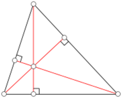 An altitude of a triangle is a straight line through a vertex and perpendicular to (i.e. forming a right angle with) the opposite side. This opposite side is called the base of the altitude, and the point where the altitude intersects the base (or its extension) is called the foot of the altitude. The length of the altitude is the distance between the base and the vertex. The three altitudes intersect in a single point, called the orthocenter of the triangle, usually denoted by H. The orthocenter lies inside the triangle if and only if the triangle is acute.