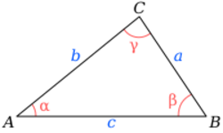 A triangle with vertices [math]\displaystyle{ A, }[/math] [math]\displaystyle{ B, }[/math] and [math]\displaystyle{ C }[/math] is denoted [math]\displaystyle{ \triangle ABC. }[/math] In describing metrical relations within a triangle, it is common to represent the length of the edge opposite each vertex using a lower-case letter, letting [math]\displaystyle{ a }[/math] be the length of the edge [math]\displaystyle{ BC, }[/math] [math]\displaystyle{ b }[/math] the length of [math]\displaystyle{ CA, }[/math] and [math]\displaystyle{ c }[/math] the length of [math]\displaystyle{ AB }[/math]; and to represent the angle measure at each corner using a Greek letter, letting [math]\displaystyle{ \alpha }[/math] be the measure of angle [math]\displaystyle{ \angle CAB, }[/math] [math]\displaystyle{ \beta }[/math] the measure of [math]\displaystyle{ \angle ABC, }[/math] and [math]\displaystyle{ \gamma }[/math] the measure of [math]\displaystyle{ \angle BCA. }[/math]