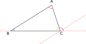 The sum of the measures of the interior angles of a triangle in Euclidean space is always 180 degrees.[9][2] This fact is equivalent to Euclid's parallel postulate. This allows determination of the measure of the third angle of any triangle, given the measure of two angles. An exterior angle of a triangle is an angle that is a linear pair (and hence supplementary) to an interior angle. The measure of an exterior angle of a triangle is equal to the sum of the measures of the two interior angles that are not adjacent to it; this is the exterior angle theorem. The sum of the measures of the three exterior angles (one for each vertex) of any triangle is 360 degrees.[note 2]