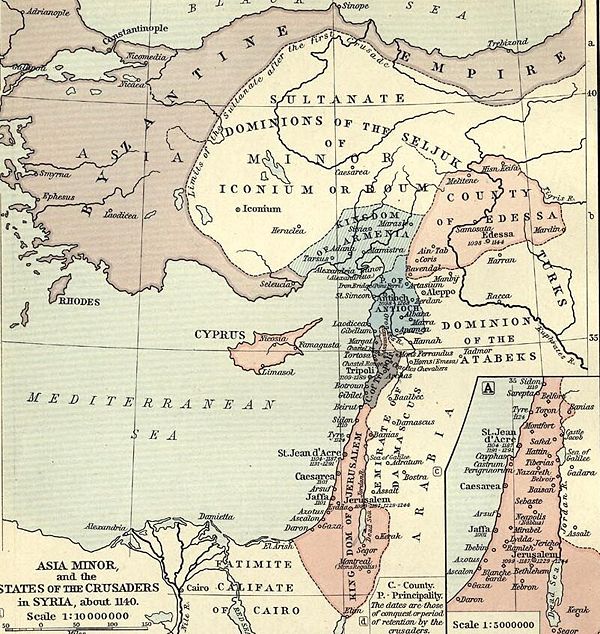 The First Crusade created four small independent countries along the coast of Syria: the County of Edessa (lasting until 1144)[15], the Principality of Antioch (lasting until 1268), the County of Tripoli (lasting until 1289), and the most important, the Kingdom of Jerusalem (lasting until the fall of Acre in 1291). Intense rivalry weakened the coalition.[16]