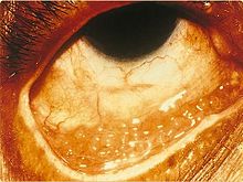 Trachoma is a chronic conjunctivitis caused by Chlamydia trachomatis.[18] It was once the most important cause of blindness worldwide, but its role diminished from 15% of blindness cases by trachoma in 1995 to 3.6% in 2002.[19][20] The infection can be spread from eye to eye by fingers, shared towels or cloths, coughing and sneezing and eye-seeking flies.[21] Symptoms include mucopurulent ocular discharge, irritation, redness, and lid swelling.[18] Newborns can also develop chlamydia eye infection through childbirth (see below). Using the SAFE strategy (acronym for surgery for in-growing or in-turned lashes, antibiotics, facial cleanliness, and environmental improvements), the World Health Organization aims for the global elimination of trachoma by 2020 (GET 2020 initiative).[22][23]