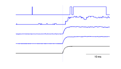 From Scholarpedia Stochastic models of ion channel gating date back as far as the pioneering work of Hodgkin and Huxley (1952), whose gating variables are often interpreted as probabilities. Sakmann and Neher directed the efforts that led to the first single-channel recordings, for which they won the Nobel Prize in Physiology and Medicine in 1991. Single-channel recordings (Sakmann and Neher, 1995) demonstrate that there are typically only two conductance states of individual ion channels: the closed and open states. Fluctuations between closed and open states appear to occur randomly ( Figure 1, top trace), presumably driven by thermal noise. Under voltage clamp, the coefficient of variation (ratio of standard deviation to mean) of the current passing through a set of independent and identically distributed stochastic channels is proportional to \(1/\sqrt{N}\ ,\) where \(N\) is the number of channels.