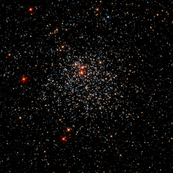 The Large Magellanic Cloud lies partially within Mensa's boundaries,[44] although most of it lies in neighbouring Dorado.[9] It is a satellite galaxy of the Milky Way, located at a distance of 163,000 light-years.[45] Among its stars within Mensa are W Mensae, an unusual yellow-white supergiant that belongs to a rare class of star known as a R Coronae Borealis variable,[46] HD 268835, a blue hypergiant that is girded by a vast circumstellar disk of dust,[47] and R71, a luminous blue variable star that brightened in 2012 to over a million times as luminous as the Sun.[48] Also within the galaxy is NGC 1987, a globular cluster estimated to be around 600 million years old that has a significant number of red ageing stars,[49] and NGC 1848, a 27 million year old open cluster.[50] Mensa contains several described open clusters, most of which can be only be clearly observed from large telescopes.[51]
