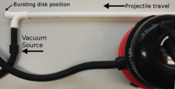 The vacuum bazooka uses a straight tube which is sealed with a type of 2 - 4 layers of aluminum foil at the muzzle and by the projectile at the breech. A tee-piece near the muzzle allows application of vacuum. When the projectile is released the air pressure behind the projectile causes it to accelerate towards the vacuum port. When the projectile reaches the vacuum port its momentum causes it to continue past and break through the bursting disk towards the target.[1] A lightweight bursting disk such as a piece of paper can be secured simply by the vacuum action when it is held against the barrel.