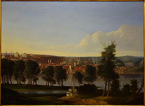The Hudson River School style involved carefully detailed paintings with romantic, almost glowing lighting. With realistic composition, they depicted romantic views of unsettled areas of the Hudson River Valley especially lakes, rocky gorges, and forests in the Catskill Mountains, the surrounding areas, the Niagara, and the American West. [3]