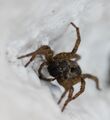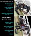 Special terms are used for spiders. Two specialized terms are useful in describing views of arachnid legs and pedipalps. Prolateral refers to the surface of a leg that is closest to the anterior end of an arachnid's body. Retrolateral refers to the surface of a leg that is closest to the posterior end of an arachnid's body.[69] Most spiders have eight eyes in four pairs. All the eyes are on the carapace of the prosoma, and their sizes, shapes and locations are characteristic of various spider families and other taxa.[70] Usually, the eyes are arranged in two roughly parallel, horizontal and symmetrical rows of eyes.[70] Eyes are labelled according to their position as anterior and posterior lateral eyes (ALE) and (PLE); and anterior and posterior median eyes (AME) and (PME).[70]