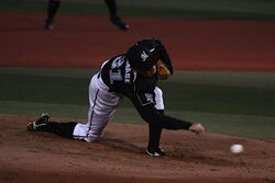 Japanese pitcher Shunsuke Watanabe is known as "Mr. Submarine" in Japan. Watanabe has an even lower release point than the typical submarine pitcher, dropping his pivot knee so low that it scrapes the ground. He now wears a pad under his uniform to avoid injuring his knee. His release is so low that his knuckles often become raw from their periodic drag on the ground.