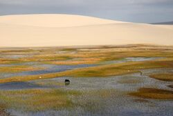 Natural ponds are those caused by environmental occurrences. These can vary from glacial, volcanic, fluvial, or even tectonic events. Since the Pleistocene epoch, glacial processes have created most of the Northern hemispheric ponds; an example is the Prairie Pothole Region of North America.[14][15] When glaciers retreat, they may leave behind uneven ground due to bedrock elastic rebound and sediment outwash plains.[16] These areas may develop depressions that can fill up with excess precipitation or seeping ground water, forming a small pond. Kettle lakes and ponds are formed when ice breaks off from a larger glacier, is eventually buried by the surrounding glacial till, and over time melts.[17] Orogenies and other tectonic uplifting events have created some of the oldest lakes and ponds on the globe. These indentions have the tendency to quickly fill with groundwater if they occur below the local water table. Other tectonic rifts or depressions can fill with precipitation, local mountain runoff, or be fed by mountain streams.[18] Volcanic activity can also lead to lake and pond formation through collapsed lava tubes or volcanic cones. Natural floodplains along rivers, as well as landscapes that contain many depressions, may experience spring/rainy season flooding and snow melt. Temporary or vernal ponds are created this way and are important for breeding fish, insects, and amphibians, particularly in large river systems like the Amazon.[19] Some ponds are solely created by animals species such as beavers, bison, alligators and other crocodilians through damning and nest excavation respectively.[20][21] In landscapes with organic soils, local fires can create depressions during periods of drought. These have the tendency to fill up with small amounts of precipitation until normal water levels return, turning these isolated ponds into open water.[22]