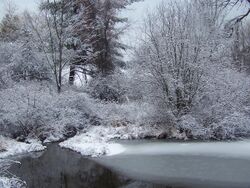 A pond is a small, still, land-based body of water formed by pooling inside a depression, either naturally or artificially. A pond is smaller than a lake[1] and there are no official criteria distinguishing the two, although defining a pond to be less than 5 hectares (12 acres) in area, less than 5 metres (16 ft) in depth and with less than 30% with emergent vegetation helps in distinguishing the ecology of ponds from those of lakes and wetlands.[2][3]:460 Ponds can be created by a wide variety of natural processes (e.g. on floodplains as cutoff river channels, by glacial processes, by peatland formation, in coastal dune systems, by beavers), or they can simply be isolated depressions (such as a kettle hole, vernal pool, prairie pothole, or simply natural undulations in undrained land) filled by runoff, groundwater, or precipitation, or all three of these.[4] They can be further divided into four zones: vegetation zone, open water, bottom mud and surface film.[3]:160–163 The size and depth of ponds often varies greatly with the time of year; many ponds are produced by spring flooding from rivers. Ponds may be freshwater or brackish in nature. 'Ponds' consisting of saltwater, with a direct connection to the sea to maintain full salinity, are normally regarded as part of the marine environment. These bodies of water do not support fresh or brackish water-based organisms, and are not considered to be ponds.