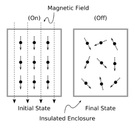 In the quest for ultra-cold temperatures, a temperature lowering technique called adiabatic demagnetization is used, where atomic entropy considerations are utilized which can be described in order-disorder terms.[23] In this process, a sample of solid such as chrome-alum salt, whose molecules are equivalent to tiny magnets, is inside an insulated enclosure cooled to a low temperature, typically 2 or 4 kelvins, with a strong magnetic field being applied to the container using a powerful external magnet, so that the tiny molecular magnets are aligned forming a well-ordered "initial" state at that low temperature. This magnetic alignment means that the magnetic energy of each molecule is minimal.[24] The external magnetic field is then reduced, a removal that is considered to be closely reversible. Following this reduction, the atomic magnets then assume random less-ordered orientations, owing to thermal agitations, in the "final" state: