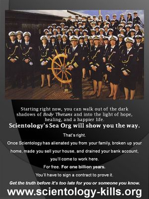 The Sea Organization, or "Sea Org", is Scientology's "advanced religious retreat" but really forms part of its vast management and bureaucratic wing. Promoted to members as some sort of utopian cruise ship in which the most advanced levels of Scientology are taught, those who have joined Sea Org instead found themselves required to sign a "billion year contract" with Sea Org, surrender their passports upon boarding, live in squalid group quarters with no privacy, perform menial chores as assigned, and suffer punishments such as being locked in the chain locker or thrown overboard for petty offenses. Sea Org makes it deliberately hard to leave by issuing those who leave a "freeloader's bill", billing them for all the auditing and services received on the ship. However, neither the "billion year contract" nor the "freeloader's bill" are legally enforceable and Scientology will never try to uphold them in a law court, knowing how hard a judge would laugh at them.