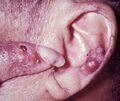 Gouty tophi presenting as nodules on the finger and helix of the ear