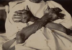 Gouty patients are, generally, either old men or men who have so worn themselves out in youth as to have brought on a premature old age—of such dissolute habits none being more common than the premature and excessive indulgence in venery and the like exhausting passions. The victim goes to bed and sleeps in good health. About two o'clock in the morning he is awakened by a severe pain in the great toe; more rarely in the heel, ankle, or instep. The pain is like that of a dislocation and yet parts feel as if cold water were poured over them. Then follows chills and shivers and a little fever... The night is passed in torture, sleeplessness, turning the part affected and perpetual change of posture; the tossing about of body being as incessant as the pain of the tortured joint and being worse as the fit comes on.[111]