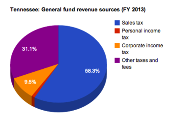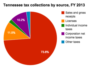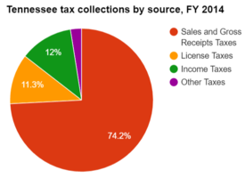 The table below lists 2014 tax collections by source as percentages of total collections. About 74.2 percent of Tennessee's total state tax collections came from sales taxes and gross receipts.[5]