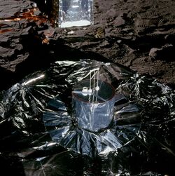Apollo 12's ALSEP included a Lunar Surface Magnetometer (LSM), to measure the magnetic field at the Moon's surface, a Lunar Atmosphere Detector (LAD, also known as the Cold Cathode Ion Gauge Experiment), intended to measure the density and temperature of the thin lunar atmosphere and how it varies, a Lunar Ionosphere Detector (LID, also known as the Charged Particle Lunar Environment Experiment, or CPLEE), intended to study the charged particles in the lunar atmosphere, and the Solar Wind Spectrometer, to measure the strength and direction of the solar wind at the Moon's surface—the free-standing Solar Wind Composition Experiment, to measure what makes up the solar wind, would be deployed and then brought back to Earth by the astronauts.[48] A Dust Detector was used to measure the accumulation of lunar dust on the equipment.[49] Apollo 12's Passive Seismic Experiment (PSE), a seismometer, would measure moonquakes and other movements in the Moon's crust, and would be calibrated by the nearby planned impact of the ascent stage of Apollo 12's LM, an object of known mass and velocity hitting the Moon at a known location, and projected to be equivalent to the explosive force of one ton of TNT.[50]