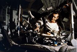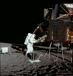 From Handwiki ![]() Commander Pete Conrad studies the Surveyor 3 spacecraft, which had landed two years previously; the Apollo Lunar Module, Intrepid, can be seen at top right. | |