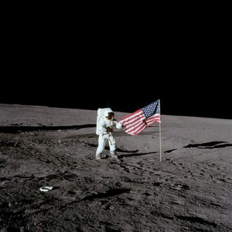 When Conrad, the shortest man of the initial groups of astronauts, stepped onto the lunar surface his first words were "Whoopie! Man, that may have been a small one for Neil, but that's a long one for me."[84] This was not an off-the-cuff remark: Conrad had made a US$500 bet with reporter Oriana Fallaci he would say these words, after she had queried whether NASA had instructed Neil Armstrong what to say as he stepped onto the Moon. Conrad later said he was never able to collect the money.[85]