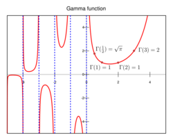The factorial function [math]\displaystyle{ n! }[/math] is the product of all of the positive integers through n. The gamma function extends the concept of factorial (normally defined only for non-negative integers) to all complex numbers, except the negative real integers, with the identity [math]\displaystyle{ \Gamma(n)=(n-1)! }[/math]. When the gamma function is evaluated at half-integers, the result contains π. For example, [math]\displaystyle{ \Gamma(1/2) = \sqrt{\pi} }[/math] and [math]\displaystyle{ \Gamma(5/2) = \frac {3 \sqrt{\pi}} {4} }[/math].[171]
