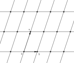 Modular forms are holomorphic functions in the upper half plane characterized by their transformation properties under the modular group [math]\displaystyle{ \mathrm{SL}_2(\mathbb Z) }[/math] (or its various subgroups), a lattice in the group [math]\displaystyle{ \mathrm{SL}_2(\mathbb R) }[/math]. An example is the Jacobi theta function