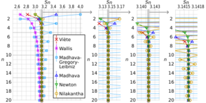 An infinite series for π (published by Nilakantha in the 15th century) that converges more rapidly than the Gregory–Leibniz series is:[89][90]