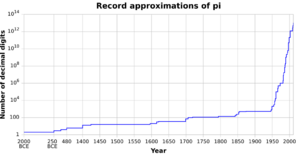 The invention of calculus soon led to the calculation of hundreds of digits of π, enough for all practical scientific computations. Nevertheless, in the 20th and 21st centuries, mathematicians and computer scientists have pursued new approaches that, when combined with increasing computational power, extended the decimal representation of π to many trillions of digits.[4][5] These computations are motivated by the development of efficient algorithms to calculate numeric series, as well as the human quest to break records.[6][7] The extensive computations involved have also been used to test supercomputers.